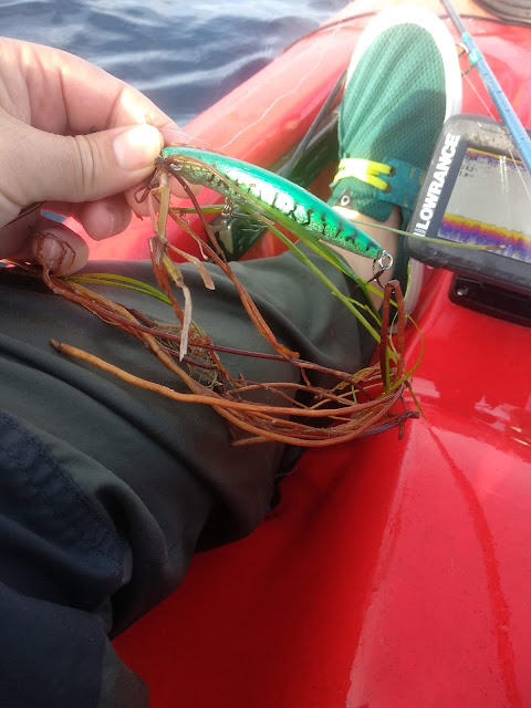 giro el kayak suelto los kurrys y no llevaría remados ni 100 metros y arreon , con la mala suerte que se suelta al principio del combate , no pasa nada , aun queda camino , vuelvo a soltar y empiezo a remar , al cabo de unos minutos veo que las cañas llevan peso pero no son peces, me fijo en el agua y esta con bastante broza.